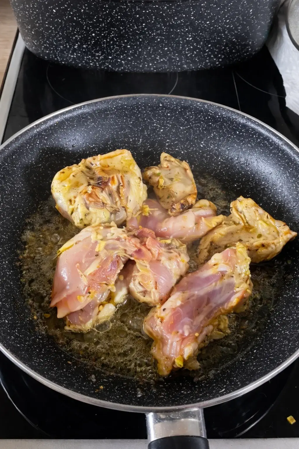 Add the rabbit pieces to the pot, browning them on all sides. This step locks in the juices and adds a delicious caramelized flavor.